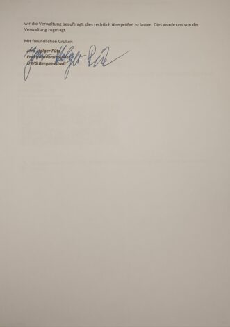 Wir haben diese Antwort als voreingenommen empfunden, da das Vorgehen der Verwaltung politisch nicht neutral ist. In der Fraktionsvorsitzendenrunde vom 1. September 2025 haben wir die Verwaltung beauftragt, dies rechtlich überprüfen zu lassen. Dies wurde uns von der Verwaltung zugesagt.
