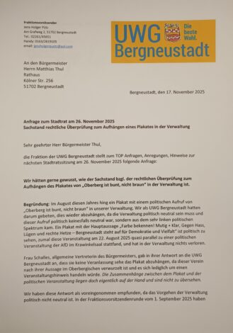 Zur nächsten Stadtratssitzung stellt die UWG Bergneustadt nachfolgende Anfrage mit dem Thema Sachstand bzgl. der rechtlichen Überprüfung zum Aufhängen des Plakates von „Oberberg ist bunt, nicht braun“ in der Verwaltung ist: