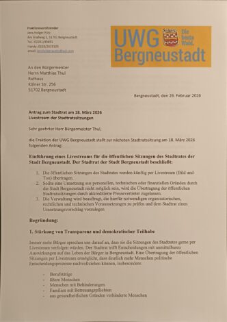 die UWG Bergneustadt stellt zum Stadtrat am 18. März 2026 den Antrag, dass zukünftig ein Livestream für die öffentlichen Stadtratssitzungen eingeführt wird.